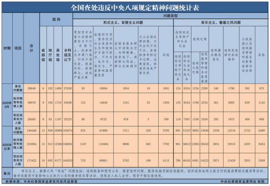 2025年9月全国查处违反中央八项规定精神问题28640起